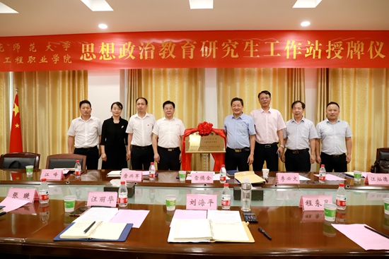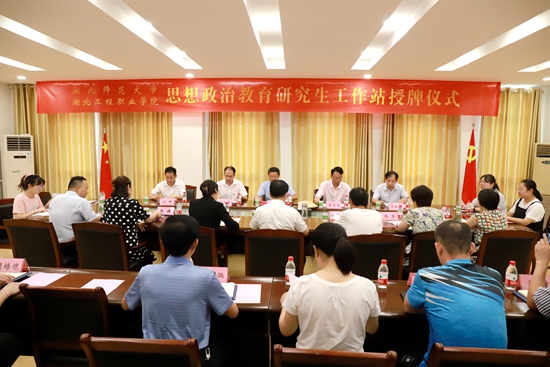 会上,我校研究生院负责人宣读工作站成立文件,湖北工程职业学院思政课部负责人和我院负责人分别针对研究生工作建设作表态发言。湖北工程职业学院党委书记刘海平和我校副校长雷儒金在大家的共同见证下,为思想政治教育研究生工作站揭牌。
