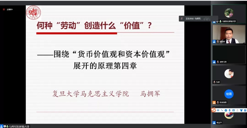 复旦大学马克思主义马拥军教授分享了以《何种“劳动”创造什么“价值”——围绕“货币价值观”和“资本价值观”展开的原理第4章》为主题的讲座。在讲到“资本主义的本质及其规律”时,马拥军教授重点分析了商品价值的规律、资本主义制度的本质以及资本主义政治制度和意识形态,并强调了授课的重点。马拥军教授指出,资产阶级的个人权利或人权体现在原子式的个人权利,是自私自利而不是相亲相爱,财产、自由、平等均体现在个人与个人的对立。在资本主义社会里,金钱万能、劳动对资本的支配权反衬出资本主义社会权力的私人化和社会契约的虚假性。“讲的太好了,深入浅出!”“哲学、政治学和经济学功底深厚”“经典、精彩、精辟”成为与会老师对此讲座最多的评价。