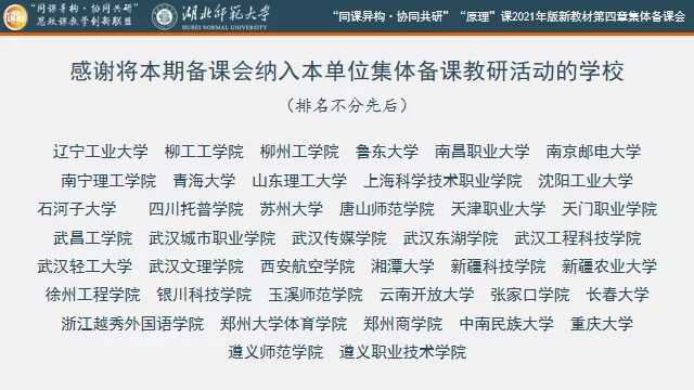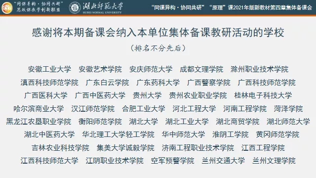 据了解,此次“原理”课新教材集体备课会吸引了来自辽宁、新疆、天津、江苏、浙江、江西等省、自治区、直辖市的近800名“原理”课教师。华中师范大学、辽宁工业大学、南京邮电大学、石河子大学、湖北大学、重庆大学等近百所高校把此次备课会纳入本单位集体备课教研活动。