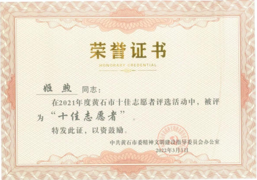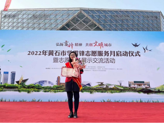为大力弘扬“奉献、友爱、互助、进步”的志愿服务精神,推动学雷锋志愿服务制度化、常态化,助力黄石市创建全国文明城市,3月5日上午,2022年黄石市学雷锋志愿服务月启动式暨志愿服务展示交流活动在人民广场举行。市委常委、市委宣传部部长周庆荣在大会上宣读了《关于2021年度黄石市十佳志愿者评选结果的通报》,并为十佳志愿者颁发了证书。我院学子姬煦荣获“黄石市十佳志愿者”荣誉称号。