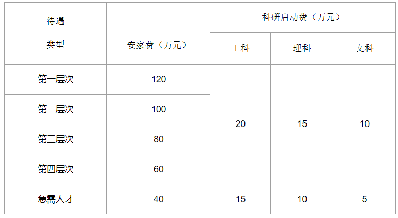 (1)安家费:办理正式入职手续后发放安家费的30%;剩余部分在一年试用期满后予以发放(但其中第一、二、三层次人才安家费的10万元须在进校五年内获批一项国家级项目后才予以发放)。