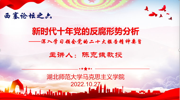 10月27日下午,我院成功举办第六次“西塞论坛”。为将学术研究和学习宣传党的二十大精神有机结合,学院特邀长期从事党史党建研究的陈克娥教授在学院会议室做题为“新时代十年党的反腐形势分析”讲座,以此带领学院师生一起深入学习领会党的二十大报告精神要旨。讲座由学院副院长汪灿德主持,新增硕士生导师和全体研究生聆听了此次讲座。