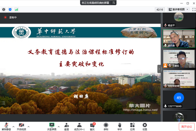 2022年11月8日晚,教育部师范专业认证专家,华中师范大学tyc122cc太阳成集团胡田庚教授应邀为我院师生在线讲解“义务教育道德与法治课程标准修订的主要突破和变化”。讲座由杨金平副院长主持,课程与教学论教研室老师、思政专业本科生和学科思政研究生听取了此次讲座。