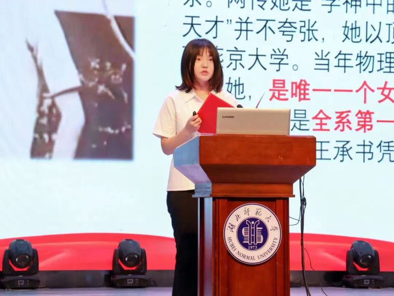 在同学们静心自省,聆听道德歌曲《不忘初心》后讲堂正式开始。讲堂中,党员肖有容同志讲述了道德模范核物理学家王承书的故事,号召大家向榜样学习;