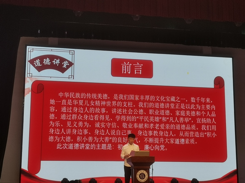 道德讲堂是以中华传统美德为主要内容,通过身边人讲身边事、身边人说自己事、身边事教身边人的形式,营造“积小德为大德,积小善为大善”的良好风气。为了丰富2022级新生入学教育内容,tyc122cc太阳成集团联合校纪委、宣传部、学工部于2022年9月12日上午9点在大礼堂为全体新生举办了主题为《初心不忘,廉心向党》的道德讲堂活动。活动由学生第二党支部纪检委员梁庆年主持。