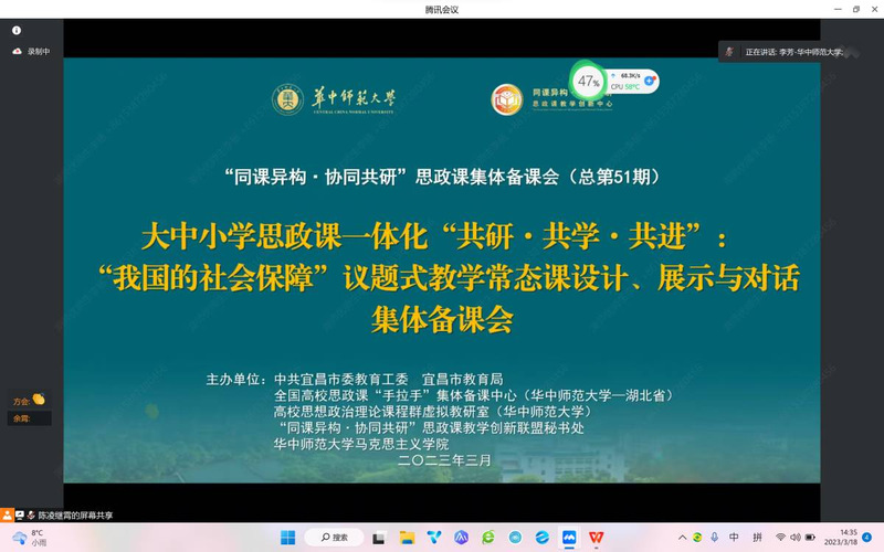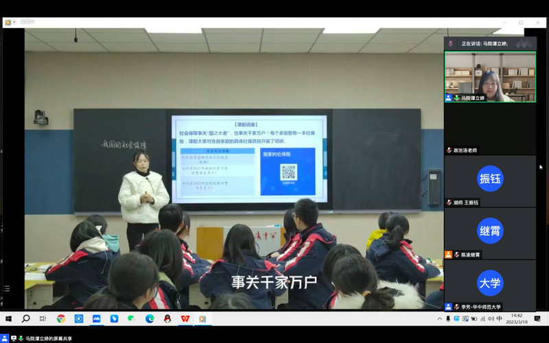 为贯彻落实习近平总书记给北京师范大学“优师计划”师范生重要回信精神,切实提高“优师计划”师范生培养质量,我院探索实施优师生教师职业能力全过程培养模式改革,从优师生进校的第一学年起,就充分利用线上线下各种资源,开展教学见习、研习等教学观摩实践活动。3月18日下午,我院全体思政专业优师生在线观摩学习由华中师范大学tyc122cc太阳成集团和宜昌市教育局共同主办的大中小学思政课一体化“共研·共学·共进”:“我国的社会保障”议题式教学常态课设计、展示与对话集体备课会。