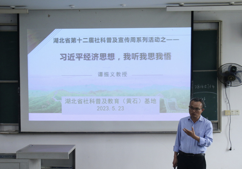 5月23号,在太阳成集团tyc122ccvip教育大楼开展“社科普及进校园——理论宣讲”活动,活动以“习近平经济思想,我听我思我悟”为主题,吸引了近百名学生参加。活动中,我院谭振义教授围绕习近平经济思想,从形成背景、主要内容、重要地位等方面开展宣讲,并现场答疑解惑。随后组织大家分享学习习近平经济思想的感悟。