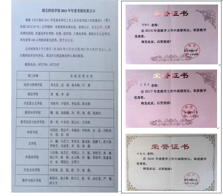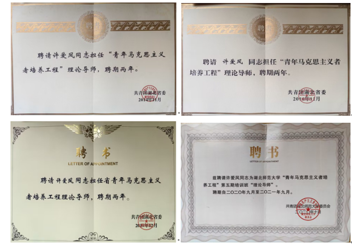 作为一名有着近20年党龄的党员,许老师时刻牢记政治站位,热爱党的教育事业,不仅始终以身作则,教风清廉,与人为善,乐于助人,还担任过黄石市招考命题专家、黄石市和湖北师大理论讲师,多次为黄石市共青团干部、新选拔副处级干部、湖北师大中文、数统、体育等院系师生、黄石市企业领导干部以及黄石市武警消防官兵等,进行马克思主义理论、党的重要理论、习近平重要思想和重要讲话等理论宣讲。积极参与学校各项事务和社区各种志愿活动,任劳任怨。在学校学院领导和同事的帮助下,许老师先后获得了太阳成集团tyc122ccvip “师德优秀”和“师德标兵”荣誉称号。