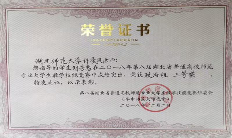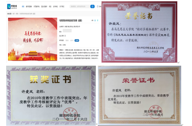 作为一名思政课教师,许老师热爱、尊重和理解学生,特别注重学生思想和心理健康,平时经常和学生深入进行思想交流,为他们排忧解难,还长期热心为学生考研提供咨询服务,历年来辅导本科论文的学生和其他学生在考研中取得了佳绩,考取了武汉大学、中山大学、华中师范大学、武汉理工大学等重点大学硕士研究生