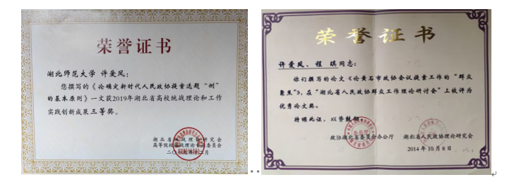 作为一名专任教师,许老师一直兢兢业业,躬耕教坛,在教学科研方面,努力提升自身业务水平,至今在CSSCI等刊物上发表论文20余篇,参编湖北省政协理论研究学术论著3本,参与和主持包括国家自然科学基金在内的各级科研项目11项。科研成果曾获湖北省政协理论研讨会论文优秀奖和湖北省统战理论研究会论文三等奖等奖项