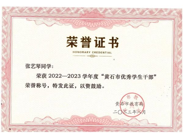 热烈祝贺我院张艺琴同学荣获2022-2023年度“黄石市优秀学生干部”荣誉称号。