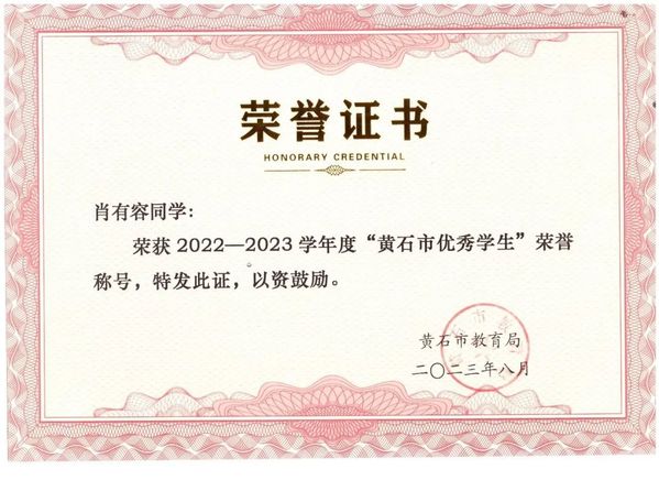 热烈祝贺我院肖有容同学荣获2022-2023年度“黄石市优秀学生”荣誉称号。