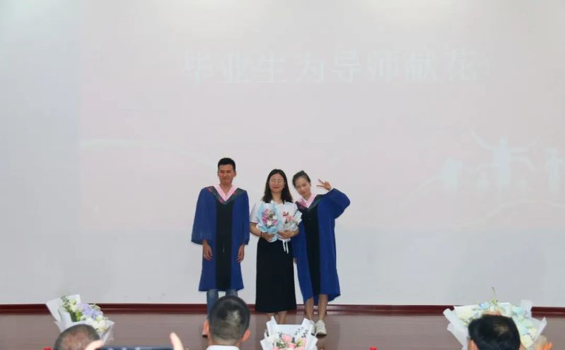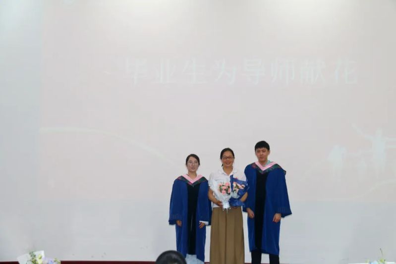 紧接着,老师们为毕业生分发了纪念品表达祝福与嘱托,毕业生为导师献上鲜花表达感恩与不舍。可谓“三年师生情,今朝惜别离;满堂祝福语,只赠学子行”。