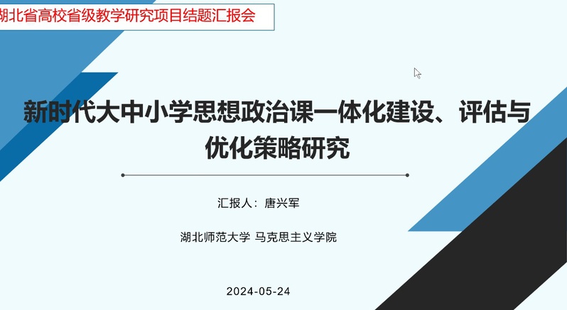 项目负责人唐兴军院长做了项目汇报,与会专家认为项目如期完成预期研究和教学实践目标,共发表论文6篇,其中核心2篇;完成了大中小学思想政治课一体化建设指标体系,并参与湖北省大中小学思想政治课一体化建设指标体系建设;在湖北省大中小学思想政治课一体化教学展示中获得“特等奖”,项目成果很丰富,社会影响很大,尤其是选择伟大的建党精神作为切入点进行大中小学思想政治课一体化建设的融合研究很有特色,达到了立项的目标要求。