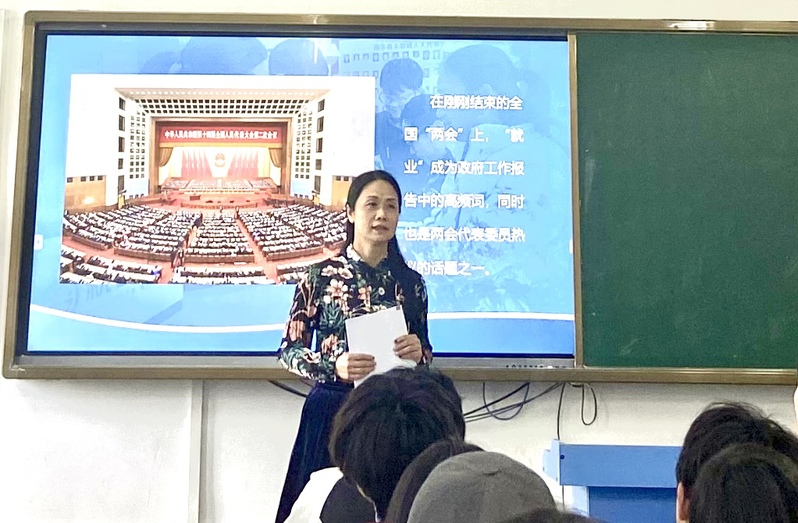 本期授课以《当前就业形势与实施就业优先战略》为主题,全体校领导深入各学院课堂,以中国特色社会主义取得的举世瞩目成就为内容支撑,以中华优秀传统文化、革命文化和社会主义先进文化为力量根基,根据学生专业背景、所处学段循序渐进设计课程目标,结合校史校情、办学特色、专业优势等校本文化设计教学内容,以学生喜闻乐见的教学方式讲清“形势”、讲明“政策”,将“形势与政策”课打造成了学生想学、爱听、笃信的思政“金课”。同学们纷纷表示,校领导讲授的思政课“如盐入水、有味无痕”,让人受益匪浅。作为新时代大学生,要认真学习专业知识、提升专业技能、练好看家本领,为实现中华民族伟大复兴作出应有贡献。