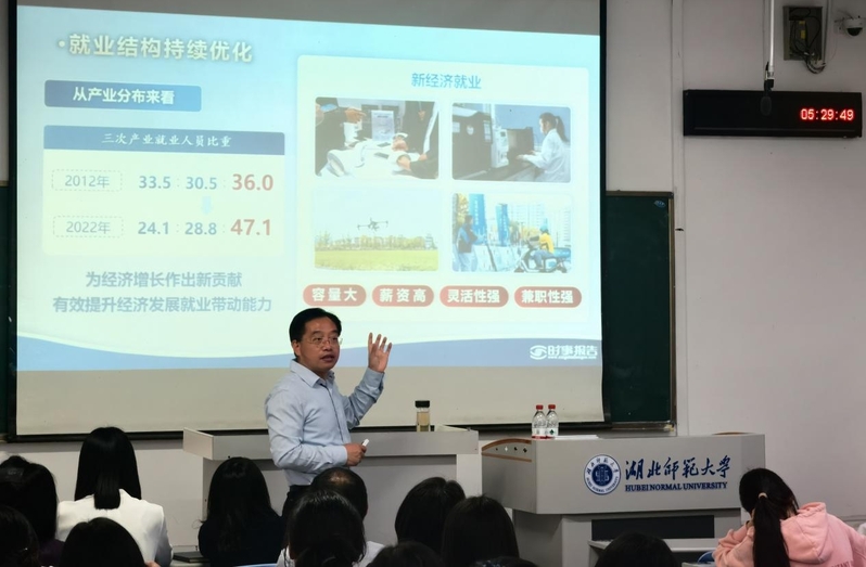 在教科院2204、2205、2206班“形势与政策”的课堂上,校党委书记李宏围绕“就业是最大的民生”这一主线,与同学们一起回顾了十八大以来党中央大力推动就业工作所取得的历史性成就和标志性成果。他指出,党中央通过实施就业优先战略、落实落细就业优先政策,在14亿多人口的大国实现了比较充分的就业,为经济发展、民生改善提供了重要支撑。青年大学生要辩证看待当前就业工作中存在的各种风险挑战,树立积极的择业观、就业观、价值观,努力成长为让党放心、爱国奉献、担当民族复兴重任的时代新人。