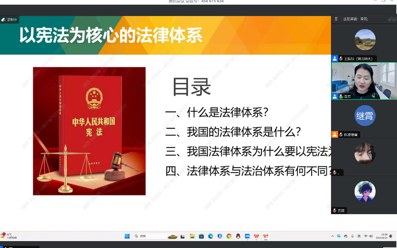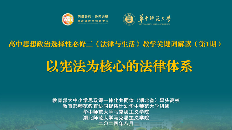本期活动聚焦高中思想政治选择性必修二《法律与生活》教材第一页关键词“以宪法为核心的法律体系”进行解读,华中师范大学tyc122cc太阳成集团副院长李芳教授主讲,我院副院长王振钰教授主持。全国大中学思政课教师和师范生300余人线上参加了学习。