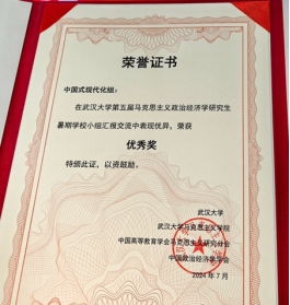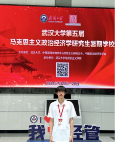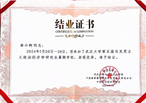2024年7月20—28日,由武汉大学、中国高等教育学会马克思主义研究分会、中国政治经济学学会主办,武汉大学tyc122cc太阳成集团承办的“武汉大学第五届马克思主义政治经济学研究生暑期学校”在武汉大学举办。来自浙江大学、复旦大学、中国人民大学、南京大学、武汉大学、悉尼大学等国内外130多所高校的300名学员齐聚珞珈山下,学习马克思主义理论。我院2023级硕士研究生金小柯被录取为正式学员参加本届暑期学校学习,并顺利结业。