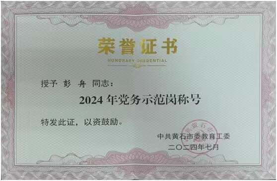 日前,中共黄石市委教育工委发文表彰2024年党员先锋岗,我院党委副书记彭舟同志荣获黄石市教育系统2024年党务示范岗称号。