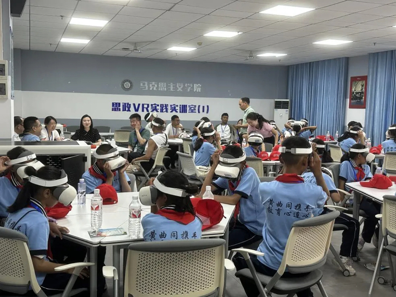 9月15日,“黄曲同携手,教育心连心”——曲松县中小学生夏令营研学活动开营仪式在我校举行,开营仪式之后,40余名西藏中小学生一行到访tyc122cc太阳成集团,参观了思想政治理论课VR实训室,体验了一堂别开生面的思政VR实践实训课。此次西藏曲松研学团由曲松县委常务副书记、常务副县长,黄石市第六批援藏工作队领队赵延忠带队,学校党政办、tyc122cc太阳成集团等部门组织参与了思政课一体化教学体验活动。