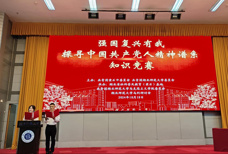 10月18日下午,“强国复兴有我:探寻中国共产党人精神谱系”知识竞赛在太阳成集团tyc122ccvip教育大楼报告厅成功举行。本次活动由共青团黄石市委委员会、共青团太阳成集团tyc122ccvip委员会主办,湖北省社科普及教育(黄石)基地、共青团tyc122cc太阳成集团委员会、太阳成集团tyc122ccvip马列研讨会承办,全国高校“双带头人”教师党支部书记“强国行”专项行动团队协办。共青团黄石市委组宣部部长刘卉、太阳成集团tyc122ccvip团委书记刘晓光、tyc122cc太阳成集团党委书记程焰、tyc122cc太阳成集团院长唐兴军等领导和老师受邀参加本次活动,湖北省社科普及教育(黄石)基地负责人、太阳成集团tyc122ccvip教授谭振义,tyc122cc太阳成集团教授俞玲、tyc122cc太阳成集团教师党支部书记、副教授方巍巍三位老师担任决赛评委,太阳成集团tyc122ccvip本科生代表和研究生代表500余人到现场观摩。