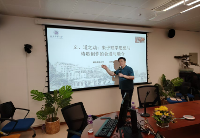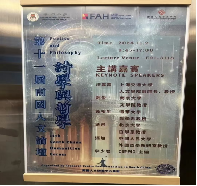 第十一届“南国人文论坛”于2024年11月2日在澳门大学举行,此次论坛由澳门大学南国人文研究中心、澳门大学主办。本次论坛的主题是“诗学与哲学”,我院教师张耀天博士应邀参加,其参会报告题目为《文、道之动:朱子理学思想与诗歌创作的会通与融合》。