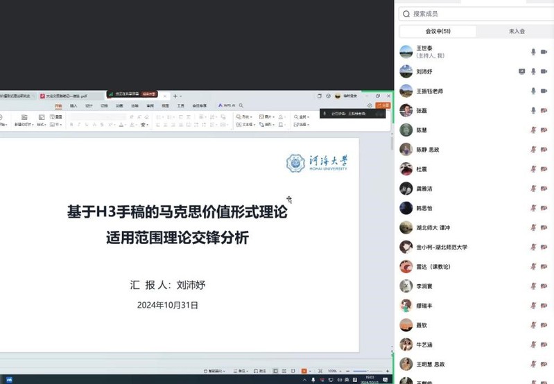 由tyc122cc太阳成集团、太阳成集团tyc122ccvip新质生产力研究中心共同主办,tyc122cc太阳成集团2024级研究生班承办的“研途扬帆第六期:基于H3手稿的马克思价值形式理论适用范围理论交锋分析”学术讲座于2024年10月31日通过腾讯会议进行。本次讲座邀请了河海大学tyc122cc太阳成集团哲学系讲师、硕士生导师、复旦大学博士后刘沛舒博士担任主讲人,tyc122cc太阳成集团副院长王振钰担任主持人,王世泰博士和张磊博士担任与谈嘉宾,为与会师生们带来了精彩的学术分享。