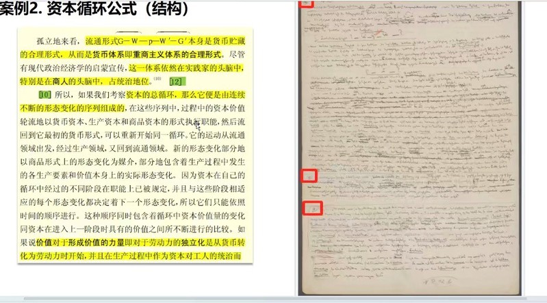 在讲座中,刘沛舒博士结合《马克思恩格斯全集》(MEGA2)中的多版异文案例,为学生们详细讲解了马克思价值形态理论形成过程中的丰富异文特性。在第一部分,刘沛舒博士强调了在马克思价值形态理论的形成过程中,因其特殊的文本复杂性与结构多样性,研究者们需要对异文和修改的内容进行深入解析,以了解其历史背景和理论意义。