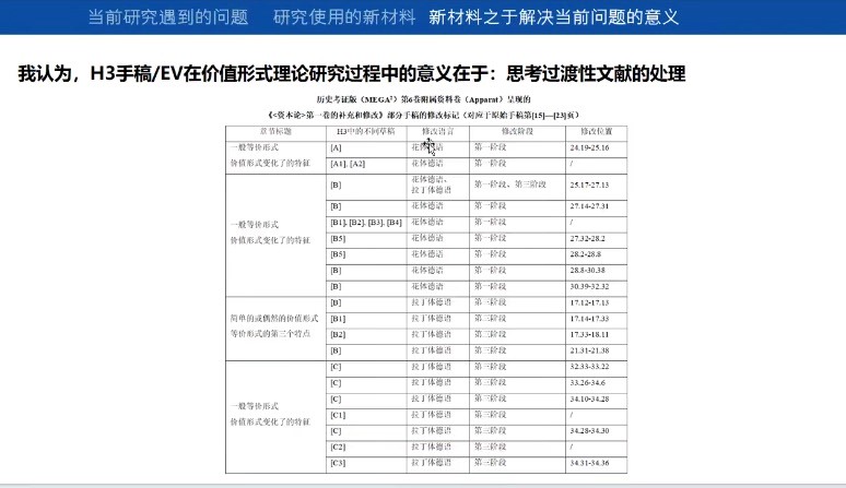 在第三部分,刘沛舒博士提到,从2021年以来的理论文献中可以看到诸多基于异文的研究成果,这些文献为我们理解价值形态理论提供了新的维度和思路。