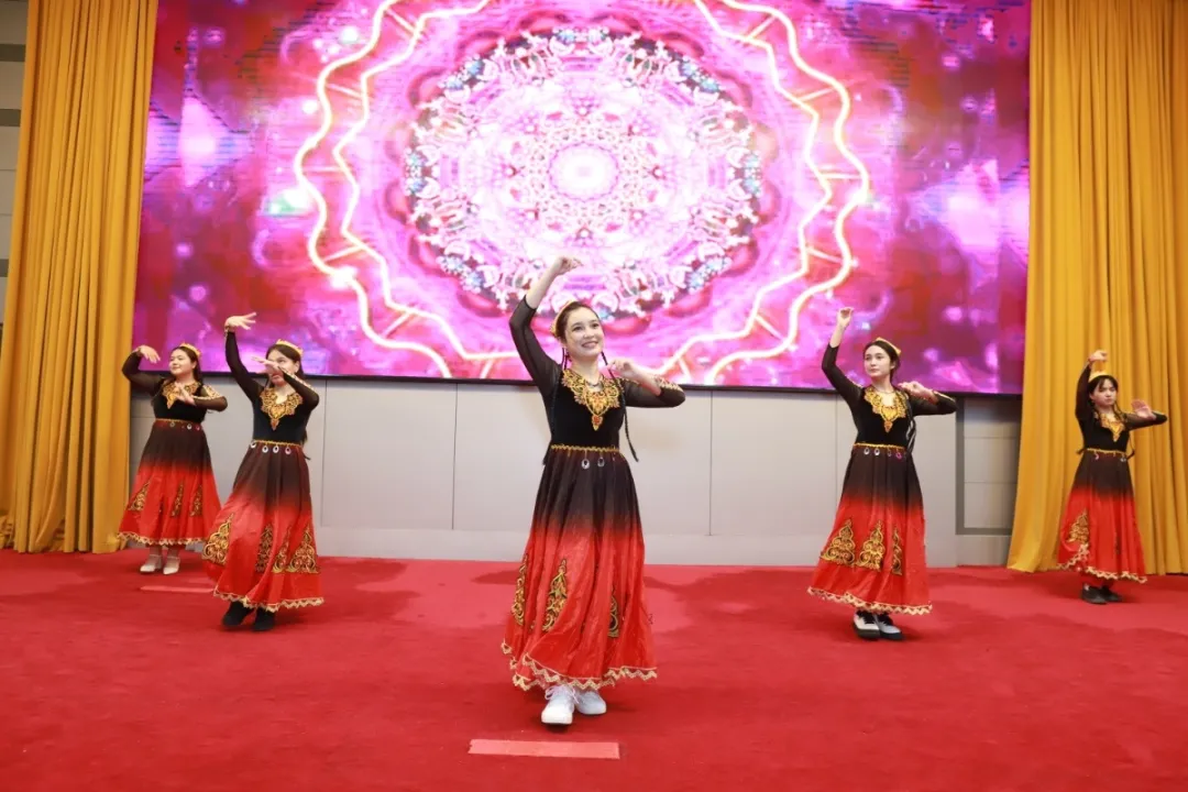 随后,师生用合唱、朗诵、舞蹈等形式献礼庆典。大合唱《南泥湾》气势磅礴,维吾尔族同学带来的舞蹈表演颇具民族特色,24级研究生芦世源的《战士卫国守安详》、赵满熠的《你在烦恼什么》声情并茂,拉丁舞表演《Can't take My eyes off you》热情洋溢,学院教师代表的诗朗诵《可爱的中国》和鸿骐宣讲团原创诗朗诵《献礼祖国华诞 谱写教育新章》真挚而热烈,健身舞《相亲相爱》展示了同学们的青春阳光。