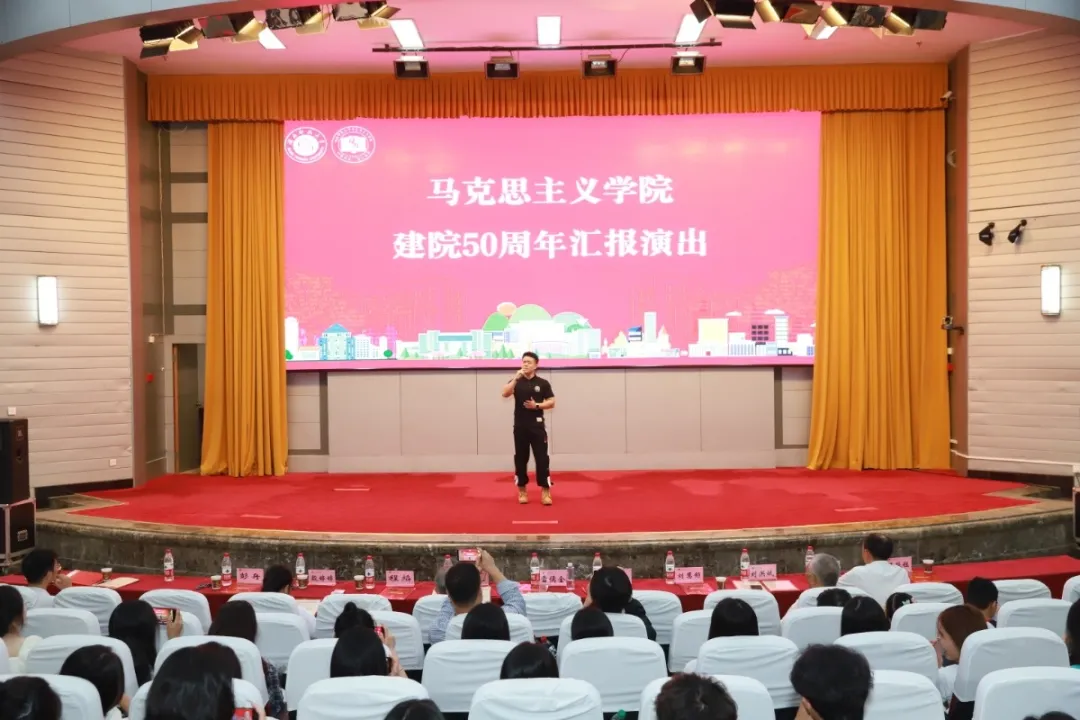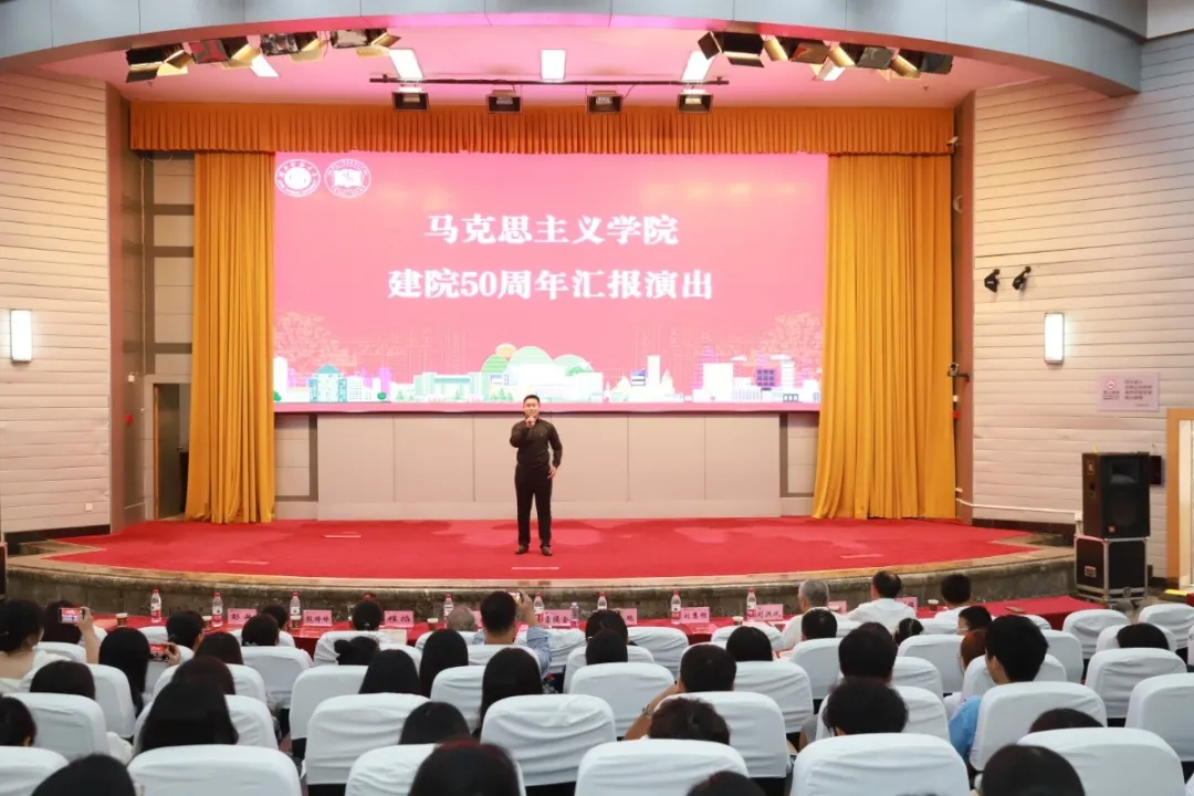 紧随短剧,周青山教授将学院五十年栉风沐雨的历程款款述来。师生们在他的讲述中看到了学院从蹒跚学步到健步如飞的成长历程,感受到了历代马院人力量的凝聚和精神的传承。