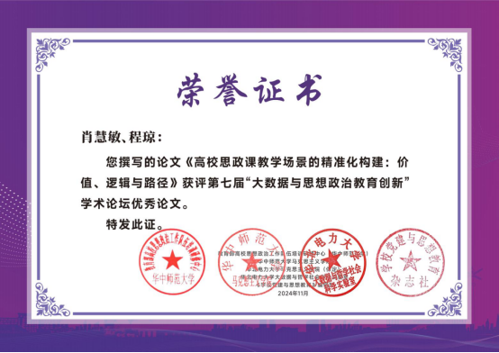 我院青年教师、硕士生导师程琼及2024级研究生肖慧敏以文赴会,文章《高校思政课教学场景的精准化构建:价值、逻辑与路径》获评本次论坛优秀论文。