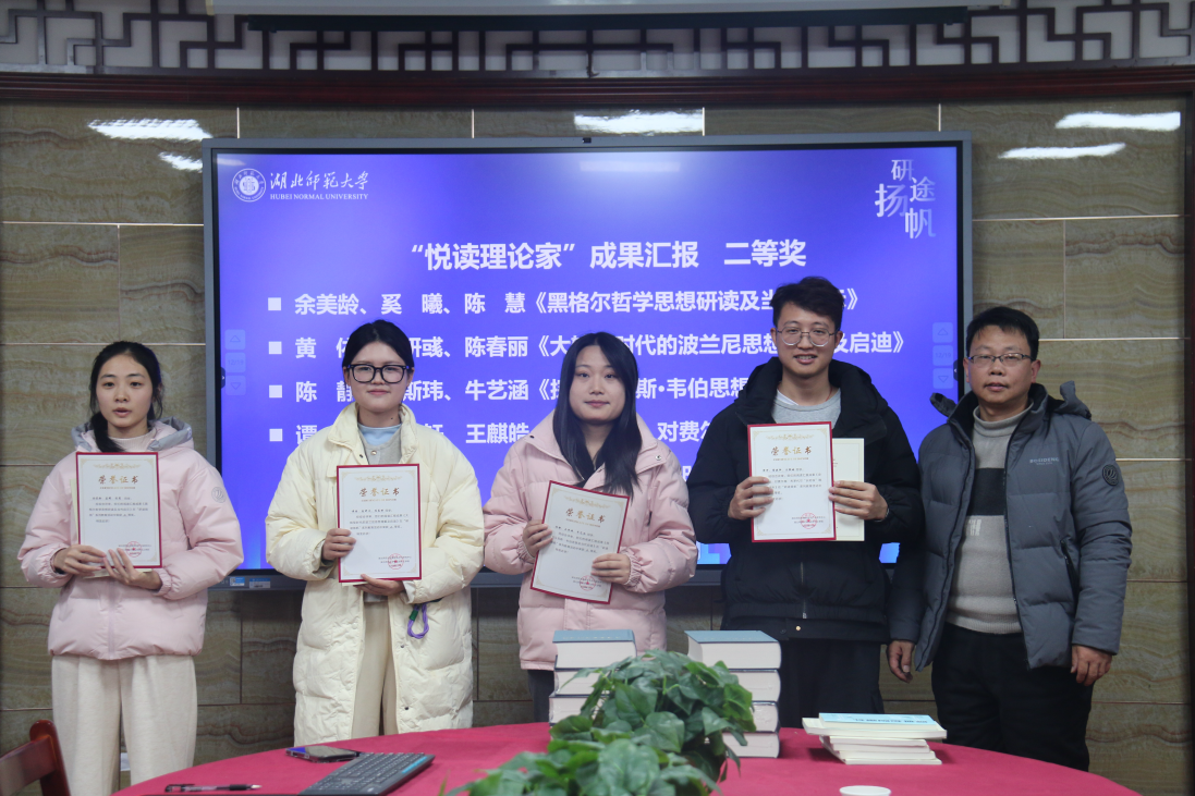 余美龄、奚曦、陈慧组的阅读汇报成果《黑格尔哲学思想研读及当代启示》、黄依、易妍彧、陈春丽组的阅读汇报成果《大转型时代的波兰尼思想理解及启迪》、陈静、王斯玮、牛艺涵组的阅读汇报成果《探索马克斯·韦伯思想及当代启迪》、谭冲、薛晓轩、王麒皓组阅读汇报成果《史学启迪:对费尔南·布罗代尔“长时段”理论的浅析》荣获二等奖,由tyc122cc太阳成集团副院长王振钰老师予以颁奖。