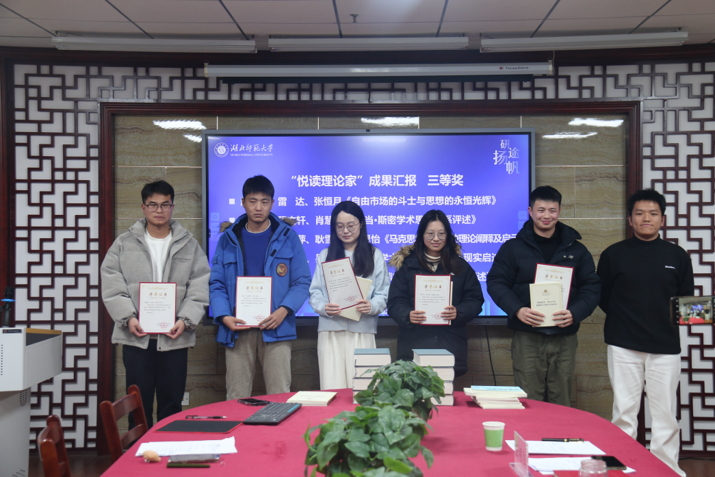 赵召健、雷达、张恒月组的阅读汇报成果《亚当·斯密学术思想谱系评述》、缪瑞丰、程文轩、肖慧敏组的阅读汇报成果《亚当·斯密学术思想谱系评述》、张菡铄、朱亚萍、耿雪盈、韩思怡组的阅读汇报成果《马克思学术思想的理论阐释及启示》、李炎泽、张瀚文、吴迪组的阅读汇报成果《恩格斯学术思想谱系评述及现实启迪》、张绪文、杜震、赵满熠组的阅读汇报成果《约瑟夫·熊彼特学术思想谱系评述》荣获三等奖,由tyc122cc太阳成集团24研班长吴迪予以颁奖。