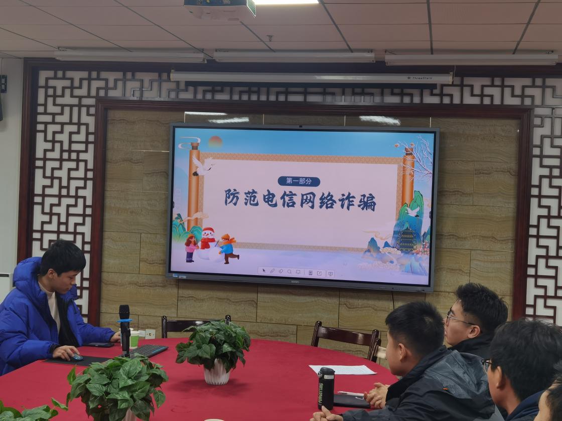 第一部分内容是防范电信网络诈骗,安全委员薛晓轩指出寒假期间正是电诈高发时期,各种刷单、网络购物、桃色陷阱等电诈形式层出不穷,因此需要同学们将反诈意识挂在心上,保持高度警惕。