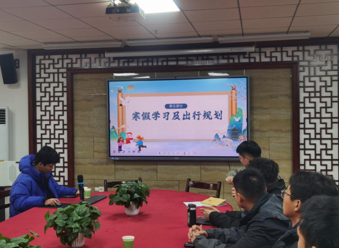 第五部分是寒假学习及出行规划,安全委员薛晓轩指出同学们要利用研究生期间的第一个假期做好自己的未来学业、职业规划,阅读一些本专业的相关书籍。最后,安全委员薛晓轩强调离校前做好宿舍卫生清洁、带走贵重物品、关好门窗,关注学院和班级群发布的消息,注意返校时间并做好返校出行规划。