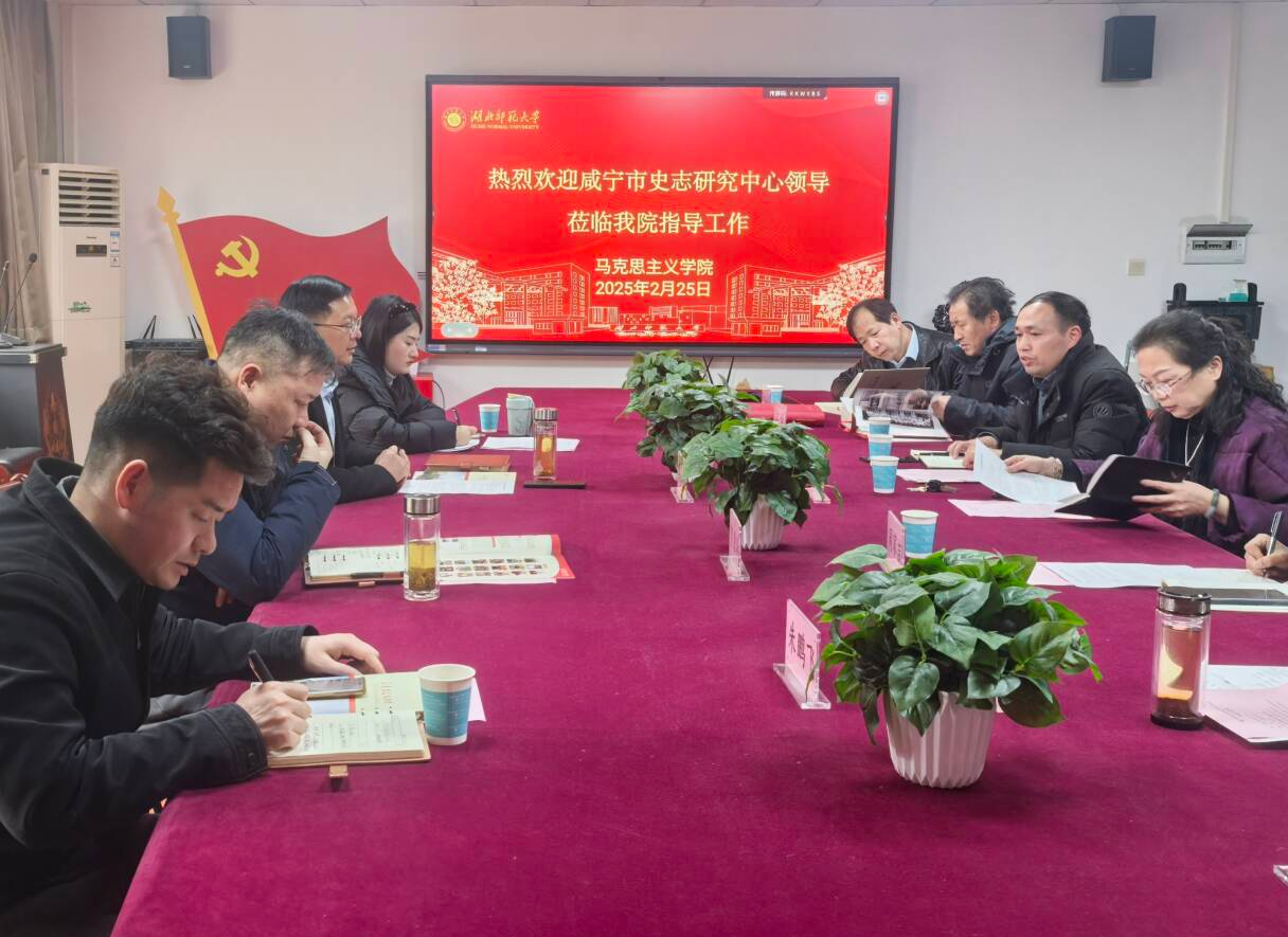 2 月 25 日,咸宁市史志研究中心主任李子鹏、副主任贺荣华一行4人到我院调研并洽谈合作,双方就“大思政课”实践基地建设、青马工程实践教学、红色资源开发利用等工作展开深入交流。我院党委书记程焰,院长唐兴军,校团委副书记周家吉、副院长杨金平、王振钰及部分教师代表出席座谈会。