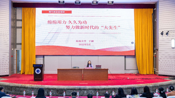 随后,海南大学于赫老师以“绵绵用力久久为功努力做新时代的‘大先生’”为题进行汇报。在第一部分中,她通过分享“周唐二老”一生默默坚守教育事业、潜心育人的故事,生动诠释了新时代青年应该如何传承和践行教育家精神。