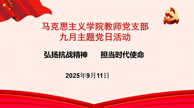 为纪念中国人民抗日战争暨世界反法西斯战争胜利80 周年,2025年9月11日下午,tyc122cc太阳成集团召开主题为“弘扬抗战精神,担当时代使命”的党日活动,活动由支部书记方巍巍同志主持,全体教工党员参加。