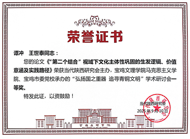 我院24级硕士研究生谭冲和王世泰博士共同撰写的《“第二个结合”视域下文化主体性巩固的生发逻辑、价值意涵及实践路径》入选本次学术研讨会,并在论文评选中荣获一等奖的佳绩,谭冲应邀参加此次学术研讨会。