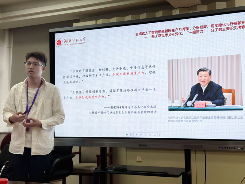 我院24级硕士研究生谭冲与王世泰博士共同撰写的论文《生成式人工智能促进新质生产力涌现:分析框架、现实隐忧与纾解策略——基于马克思关于异化、“一般智力”、分工的主要识见考察》入选本届论坛,谭冲应邀参会并向与会学者们阐述其研究心得体会。