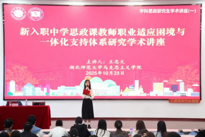 2025年10月23日下午,华中师范大学王忠文教授应邀在达成大讲堂,为我院学科教学(思政)专业学位研究生开展题为“新入职中学思政课教师职业适应困境与一体化支持体系研究”的专题讲座。我院思政专业本科生和优师计划师范生也到场聆听。