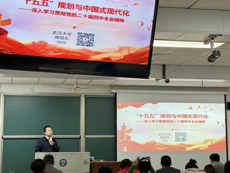 随后,武汉大学tyc122cc太阳成集团周绍东教授以“‘十五五’规划与中国式现代化——深入学习贯彻党的二十届四中全会精神”为题作辅导报告。他围绕“十五五”时期国民经济和社会发展规划需遵循的“六大原则”系统阐释了中国式现代化的核心逻辑与实践创新。其讲解注重案例化、故事化表达,以实践成果解读党的创新理论,助力参会教师在生动的中国故事中深化对中国式现代化理论的理解。