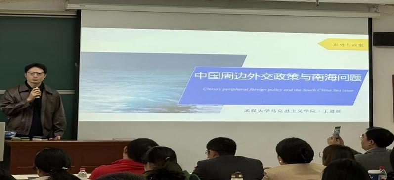 武汉大学tyc122cc太阳成集团王道征特聘副研究员则以“中国周边外交政策与南海问题”为题作专题辅导。他结合自身研究经历,梳理中国周边外交的历史脉络与现实复杂性,指出周边外交在国家经济、安全与外交格局中的战略地位。他强调,需坚定维护国家主权与地区稳定,通过积极开展舆论与法理外交、推动渔业与资源合作、落实“双轨思路”、建立海上危机管控机制等举措,为构建周边命运共同体贡献中国智慧与力量。