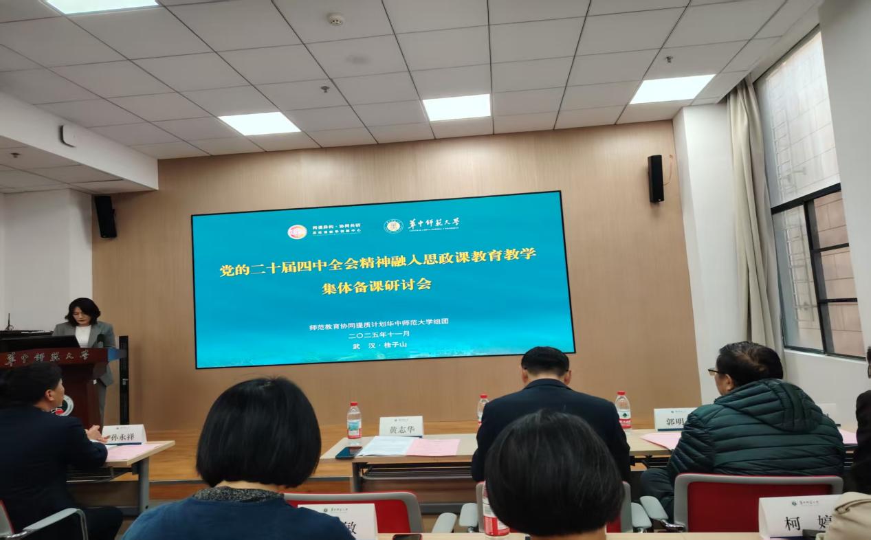 (本报讯) 2025年11月15日,荆楚大地秋意正浓,学术交流热情不减。为深入学习、贯彻落实党的二十届四中全会精神,并推动其融入思想政治理论课教学体系之中,华中师范大学组织开展党的二十届四中全会精神融入思想政治教育教学集体备课研讨会。我院习近平新时代中国特色社会主义思想教研室(以下简称“教研室”)全体教师参与此次教研活动。在专题研讨与交流环节,陈智会老师做主题发言。此次跨校教研活动不仅是一次思想的碰撞与智慧的汇聚,更是一次校际协同、共谋思政育人新篇的生动实践,取得了丰硕成果。