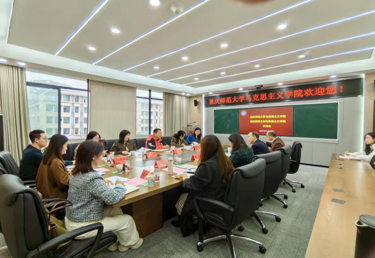 在重庆师范大学tyc122cc太阳成集团,党委书记李晓燕教授致欢迎辞并系统介绍学院发展概况,重点阐释了马克思主义理论学科建设路径与青年骨干教师培育机制。副院长侯玲教授聚焦人才培养,详解了思政专业本硕一体化培养方案、“优师计划”实施路径及青年教师科研管理体系等。副院长田方林教授则以“校地现场互联互动一体化场景体验式大思政课”为核心,深入分享了理论与实践教学融合的创新模式及实践基地建设经验。马原教研室主任李洪淑副教授针对《马克思主义基本原理》课程,拆解了“线上资源库+线下互动课堂”双向教学模式的构建逻辑与实践案例。座谈交流环节,双方就大中小学思政课一体化、“行走的思政课”实践体系、乡村振兴实践基地共建、红色资源融入教学等议题达成共识。他们表示,期待与我院在教学创新、资源共享、科研协作等领域开展深度合作,共探思政教育新路径。