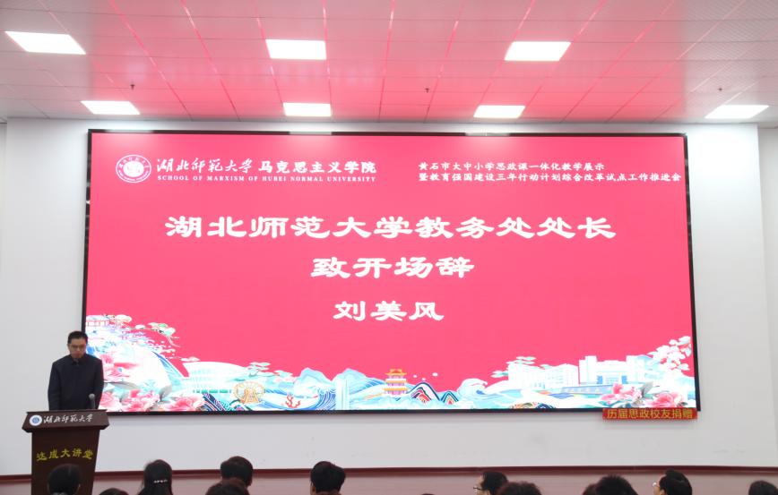 活动伊始,太阳成集团tyc122ccvip教务处处长刘美风致开场辞。他强调,思政课作为立德树人的关键课程,推进一体化建设是打破学段壁垒、实现育人体系贯通的重要举措,对统筹各阶段思政教育内容衔接、方法创新与资源整合具有深远意义。刘教授进一步指出,该建设方向与教育强国三年行动计划综合改革试点目标高度契合,将为黄石地区思政教育高质量发展注入强劲动力。致辞尾声,刘美风教授代表主办方,向出席活动的各级教育部门代表、大中小学思政课教师、专家学者及学生代表致以诚挚欢迎,对各方在会议筹备及前期工作中的支持表示感谢。