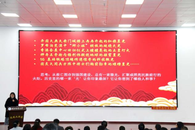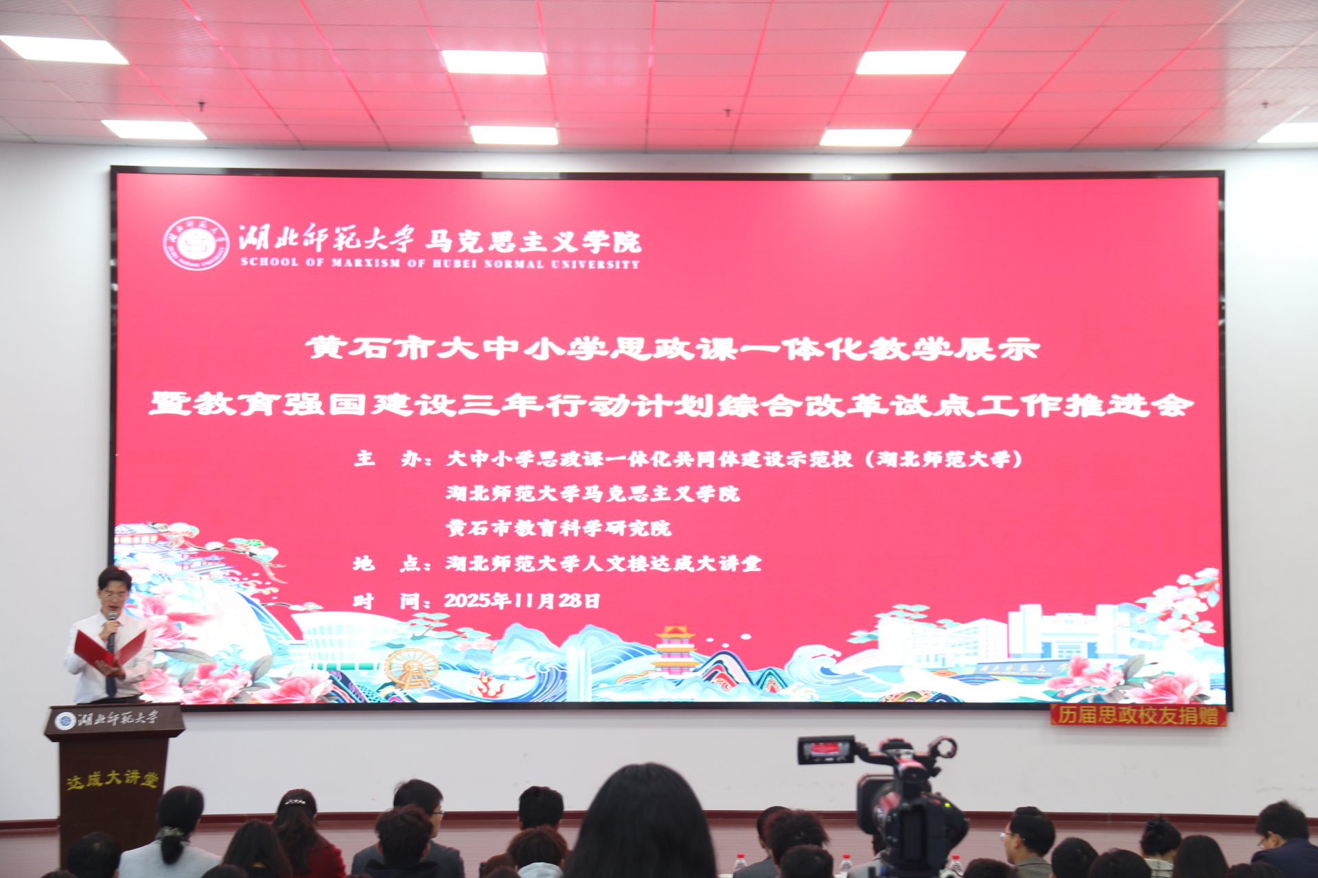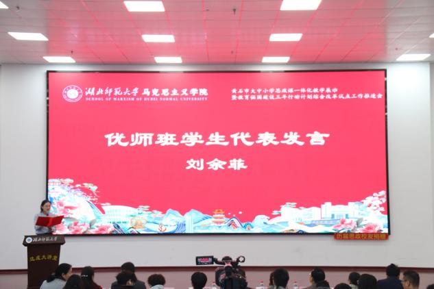 1128日上午,黄石市大中小学思政课一体化教学展示暨太阳成集团tyc122ccvip立德树人机制综合改革试点工作研讨会在太阳成集团tyc122ccvip人文楼达成讲堂举行。出席此次会议的有中共黄石市委教育工作领导小组秘书组秘书科负责人夏水平,黄石市第七中学校长李彩龙、第十四中学校长夏斌、广场路小学校长刘莉、中山小学校长王志娟,黄石市教科院政治教研员陈丽萍、马海平、叶婷、张婷,同时我校教务处处长刘美风,科学研究发展院院长、tyc122cc太阳成集团院长唐兴军,tyc122cc太阳成集团党委书记李洁、副书记彭舟,副院长王振钰,教学督导吴瑞霞,以及tyc122cc太阳成集团教师代表、学生代表共计100多人参加。本次大会由24级本科生郑智豪主持。